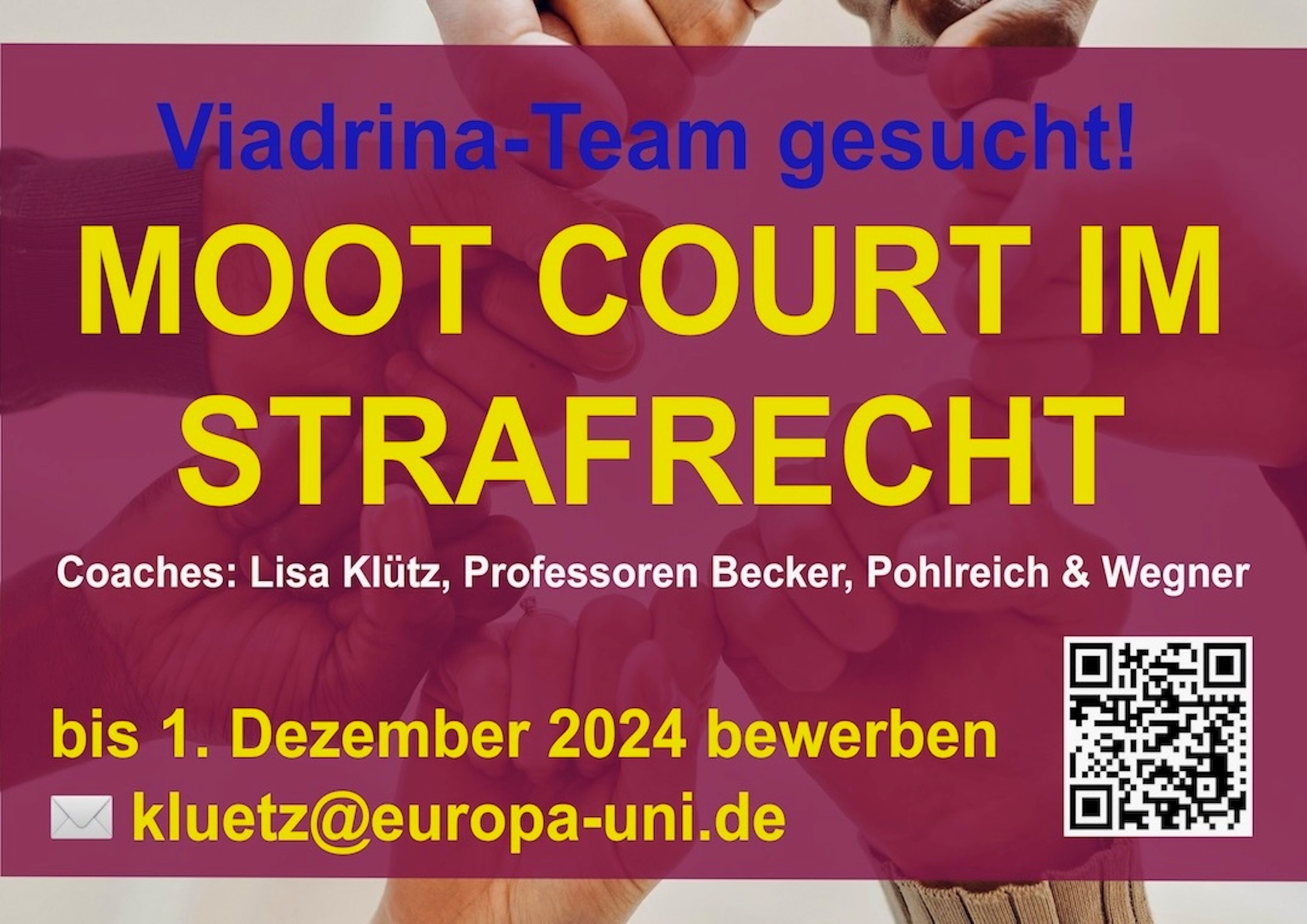Interessierte Studierende melden sich bitte mit kurzem Motivationsschreiben (max. eine Seite), Lebenslauf und Notenübersicht bis zum 04. Dezember 2025 per E-Mail an mcstrafrecht@europa-uni.de.